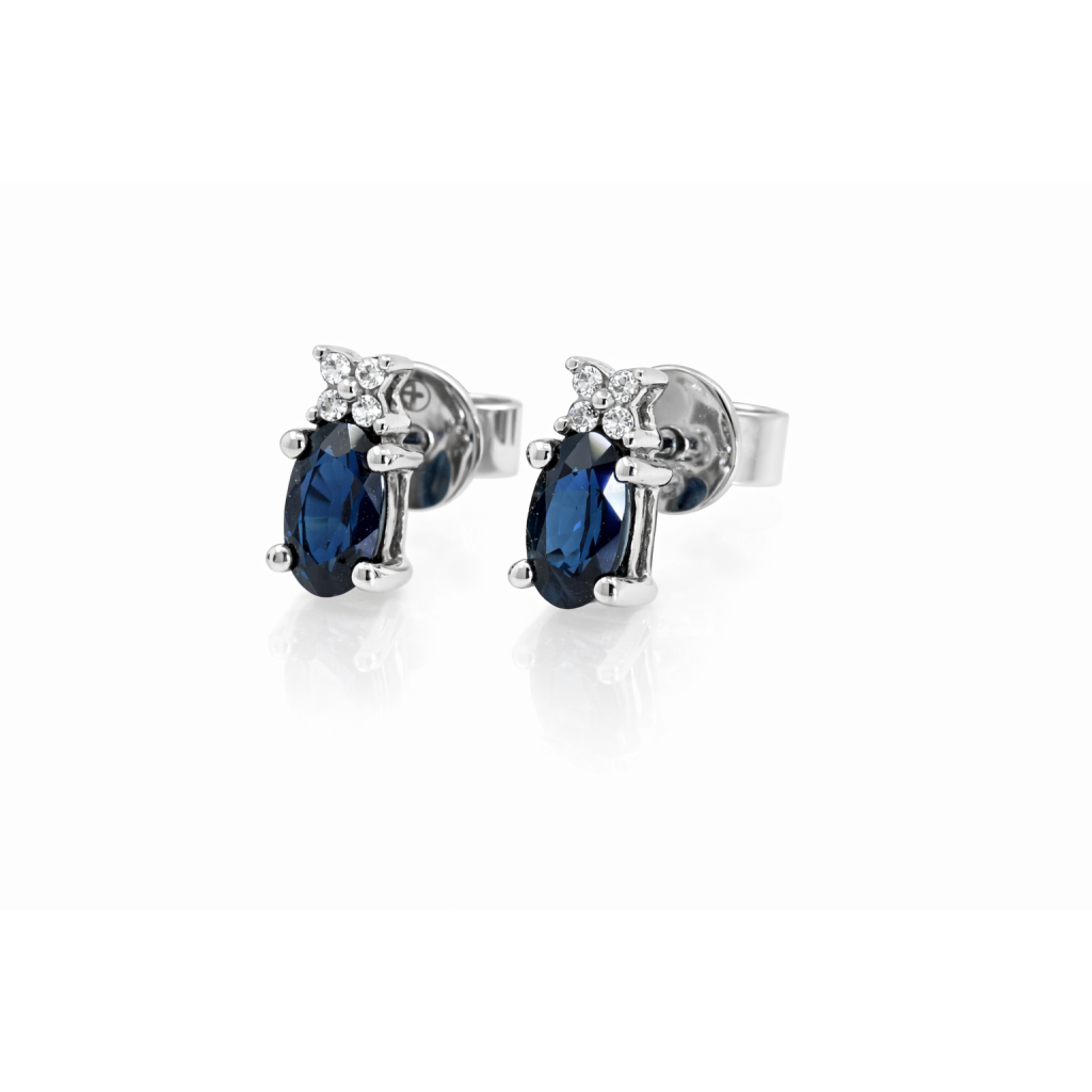 Elegantní náušnice z bílého zlata osazené přírodními safíry, doplněné menšími přírodními diamanty, které podtrhují jejich třpyt a jemný luxusní vzhled. Nadčasový šperk vhodný pro každodenní nošení i výjimečné příležitosti.