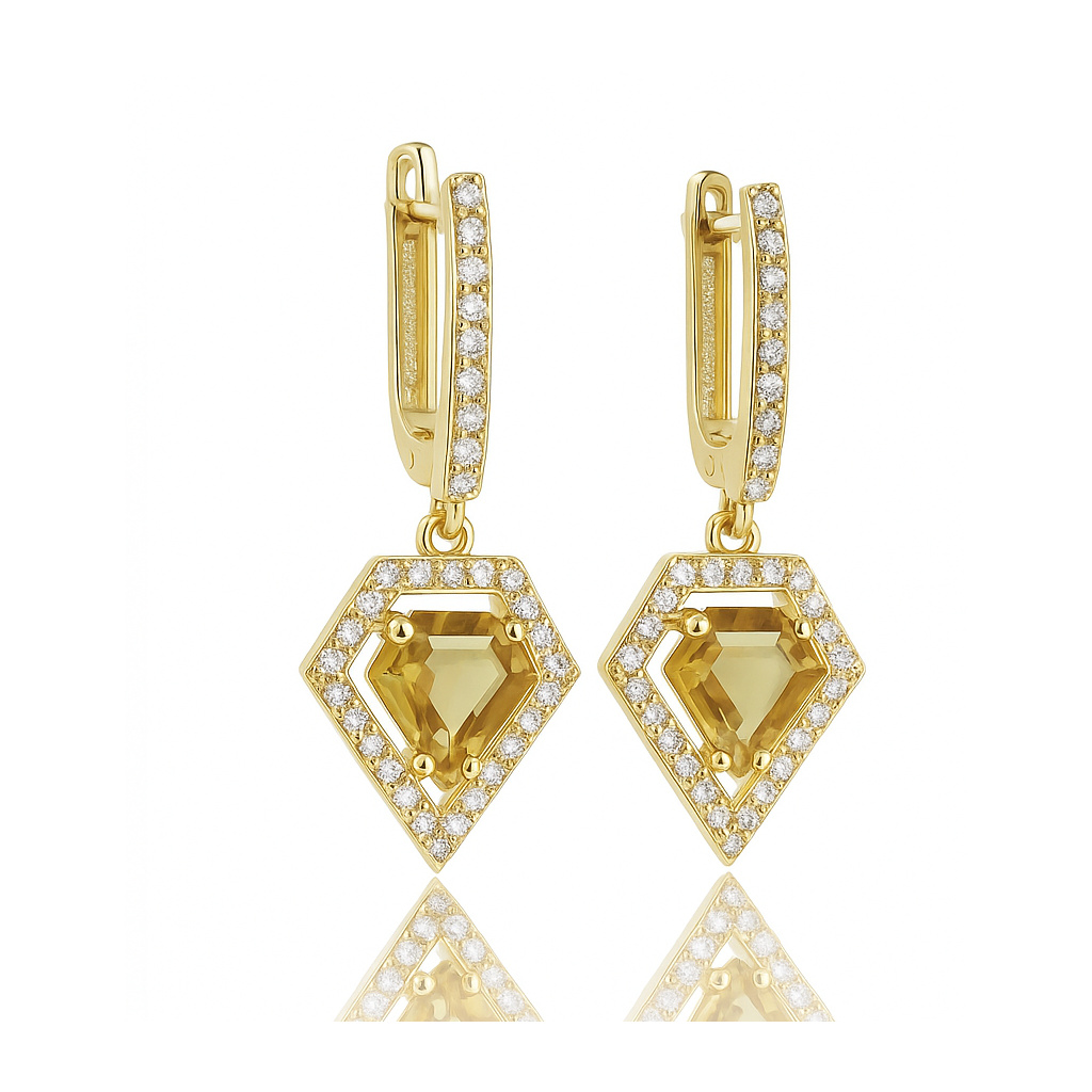 Náušnice ze žlutého zlata osazeny alexandrity a zirkony. Alexandrit je jedním z nejcennějších drahokamů, který pod různými typy a úhly světla mění barvy od jasně žluté po temně hnědou. Tuto jedinečnou vlastnost má kámen díky obsahu stopového množství chromu.