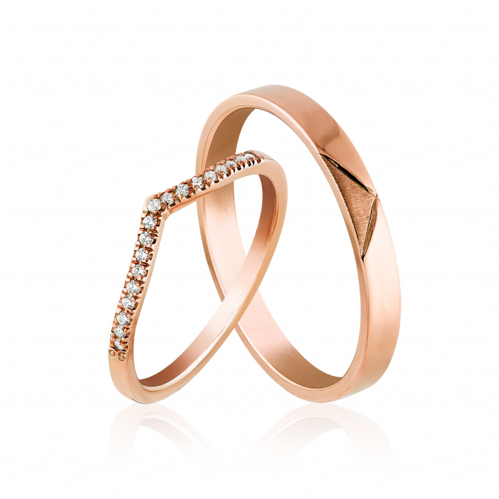 Luxusní diamantové snubní prsteny z růžového zlata. Dámský prsten ve tvaru V je vhodný k nošení se zásnubním prstýnkem. Je osazen devatenácti diamanty o průměru 1,15mm a je široký 1,6mm. Pánský prsten je široký 3mm. Prsteny je možné zhotovit z jakékoli barvy zlata nebo z platiny.