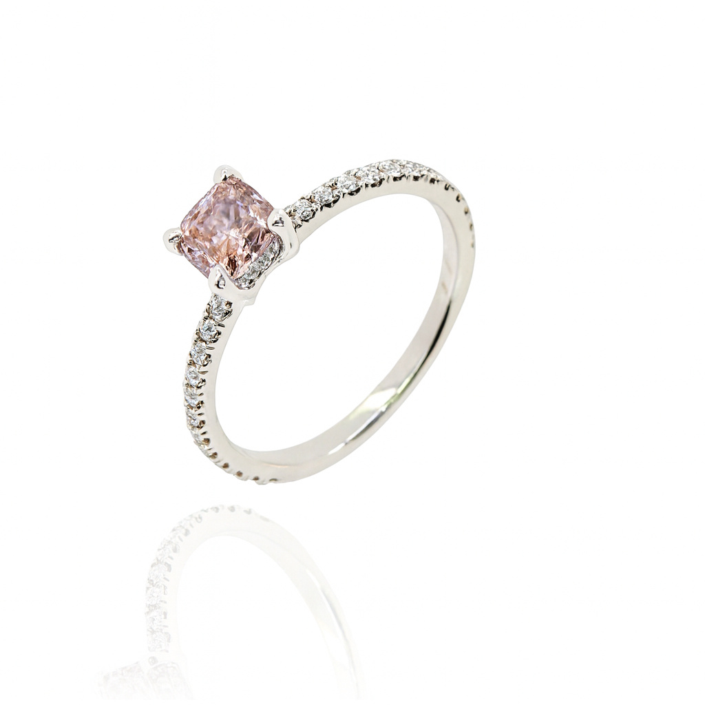 Luxusní prsten z bílého zlata osazený centrálním briliantem barvy Natural Fancy Pink-Brown a menšími bílými brilianty po stranách.